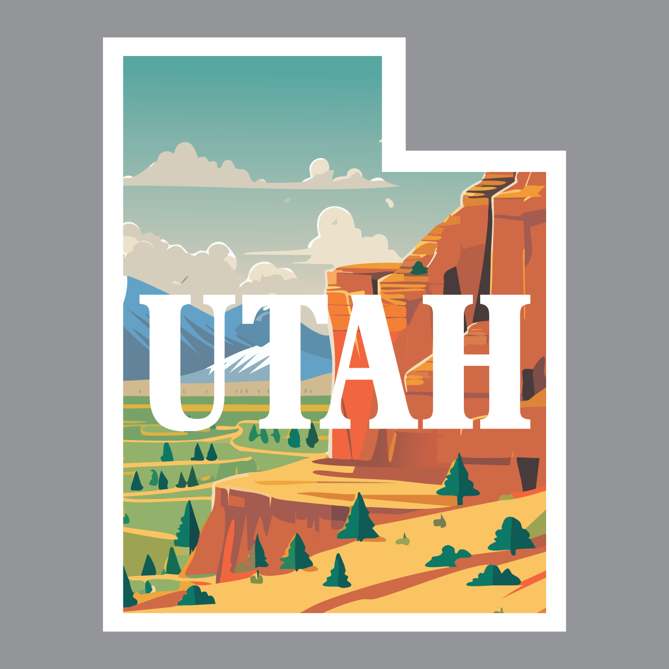 Show off your love for the Beehive State with this Utah-shaped sticker featuring a vibrant desert and mountain background that captures the state’s iconic scenery. Measuring 3″ x 4″, this full-color design proudly displays Utah across the front, celebrating the state’s stunning red rock landscapes and towering peaks.